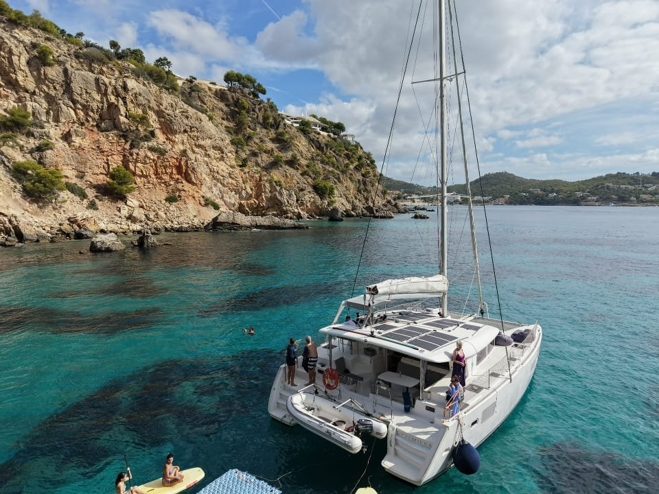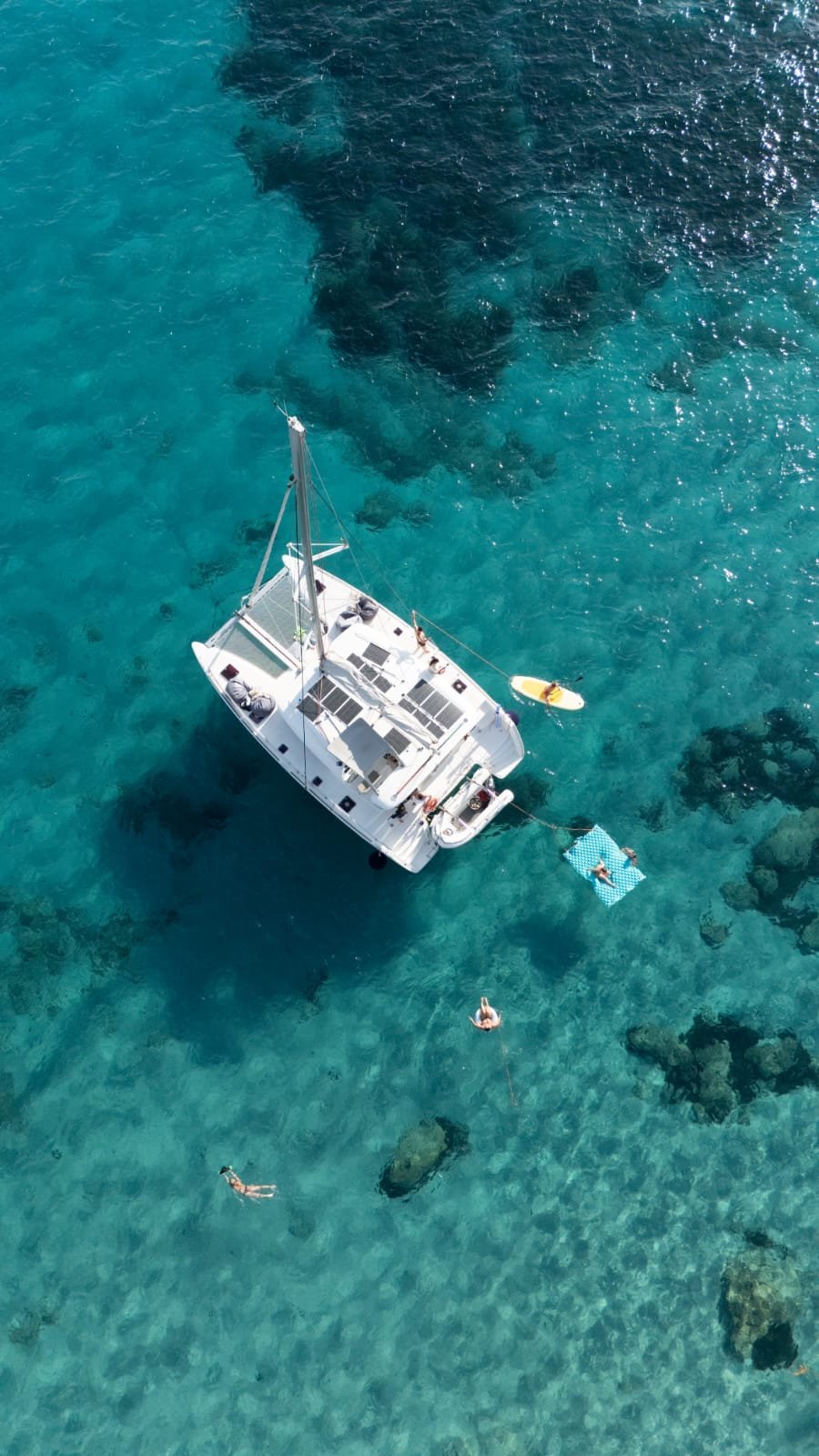 Con casi 12 metros de eslora y unos espacios inmensos, tendrás sitio de sobra para tomar el sol en los pufs, descansar en la cubierta o bañarte en calas escondidas gracias a que su diseño permite fondear muy cerca de la costa. Tus anfitriones a bordo, Daniel y Natasha, se encargarán de que no os falte de nada. Si el viento acompaña, izarán las velas para una navegación mágica en silencio. Y si te atreves… ¡te dejarán tomar el timón un rato!